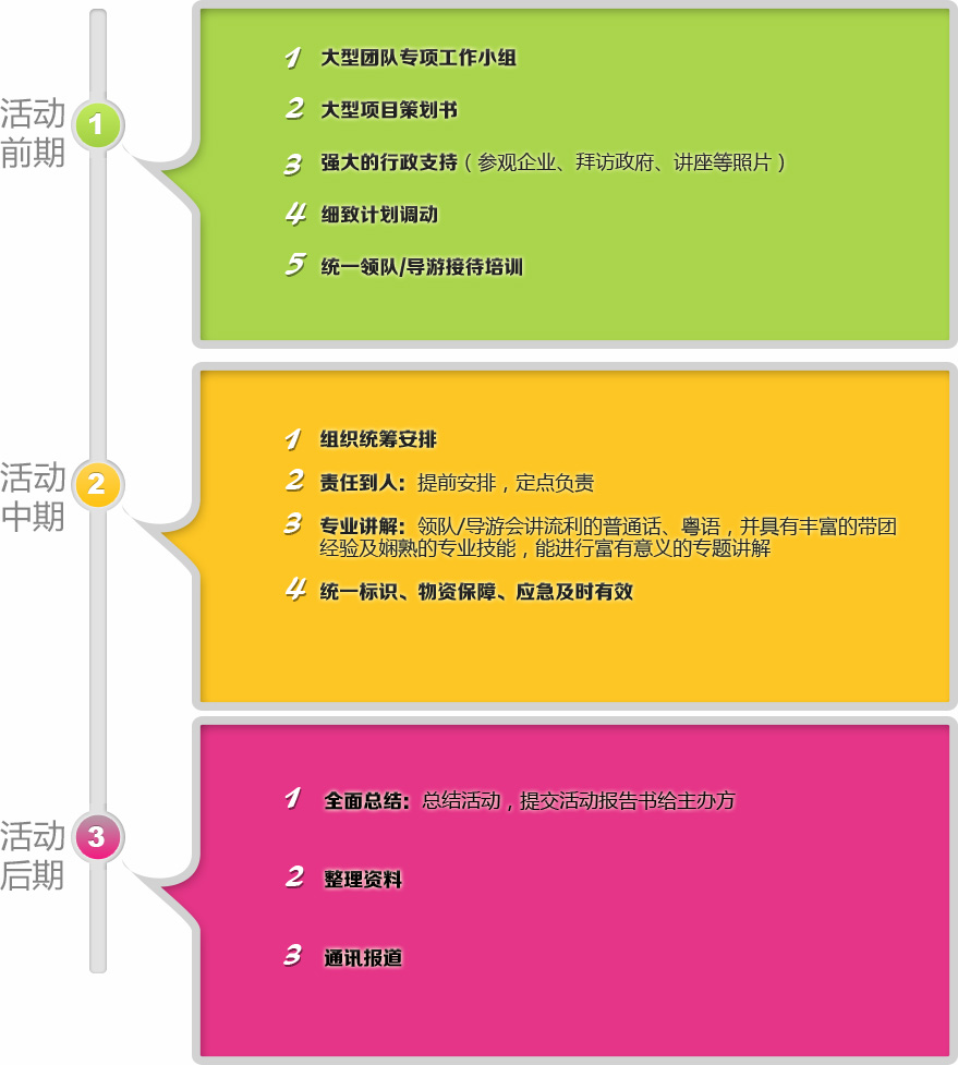 香江旅游专业做大团。由于人数多,大型主题团队与一般旅游团要求更加严格,大型团队如何统筹、导游接待如何标准、工作人员如何分配、房餐车如何调度安排、人数多如何预防突发事件的发生并及时解决等。香江旅游经过多年的积累,在操作大型主题活动有非常丰富的经验,并形成了「香江大团模式」“前期组织策划——中期统筹安排——后期全面总结”。